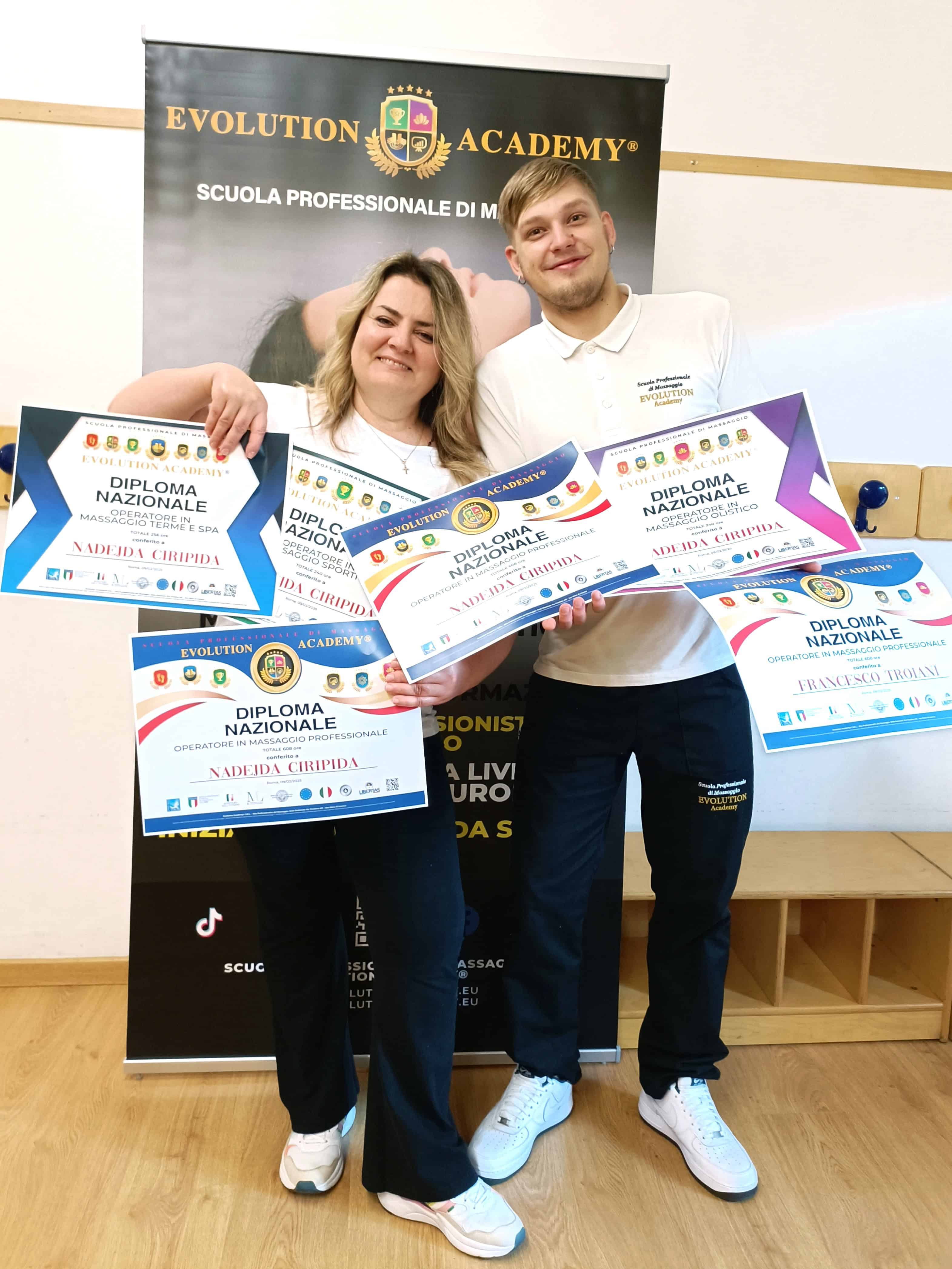 Il termine di tutti i Corsi di Massaggio Riconosciuti Evolution Academy®, una volta superato il test pratico finale, riceverai l’Attestato di Merito. Allo stesso modo, riceverai l’Attestato di Aggiornamento alla conclusione del secondo weekend di ripasso del corso.