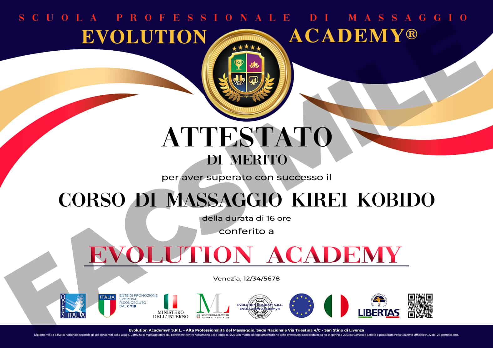 Alla fine del corso di massaggio kirei e kobido, se avrai superato il test finale, ti verrà rilasciato un attestato di merito, riconosciuto su tutto il territorio nazionale,ai sensi della legge 4/2013, approvata in data 14 gennaio 2013 da camera e Senato e pubblicata nella Gazzetta ufficiale nr 22 del 26 gennaio 2013. A seguito della partecipazione delle giornate di ripasso, otterrai un attestato di aggiornamento.