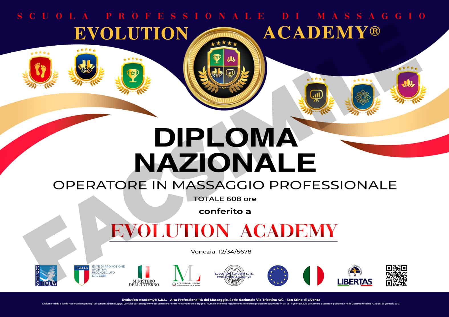 Il termine di tutti i Corsi di Massaggio Riconosciuti Evolution Academy®, una volta superato il test pratico finale, riceverai l’Attestato di Merito. Allo stesso modo, riceverai l’Attestato di Aggiornamento alla conclusione del secondo weekend di ripasso del corso.