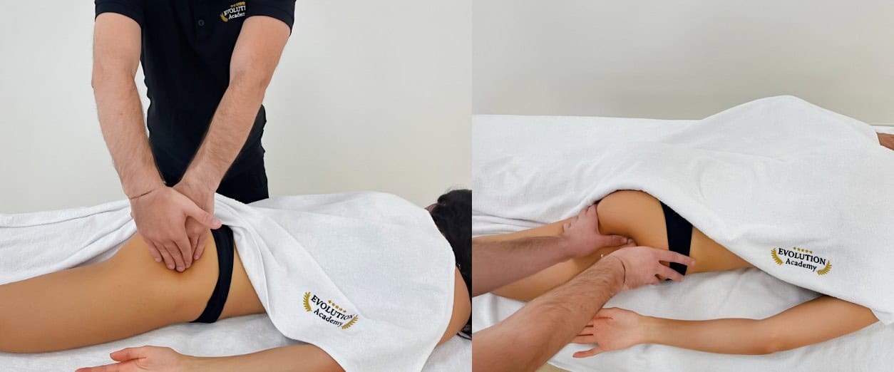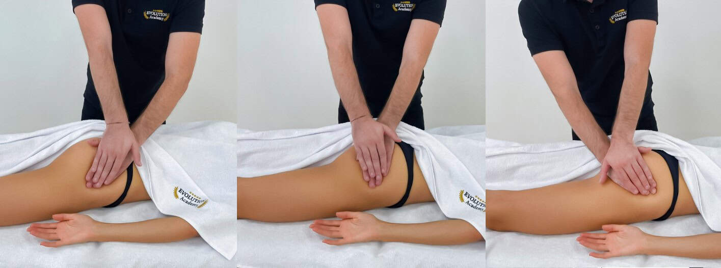 - Cliente in posizione prona: eseguire uno sfioramento superficiale a cuore bimanuale alternato partendo dal sacro fino al coxo femorale.